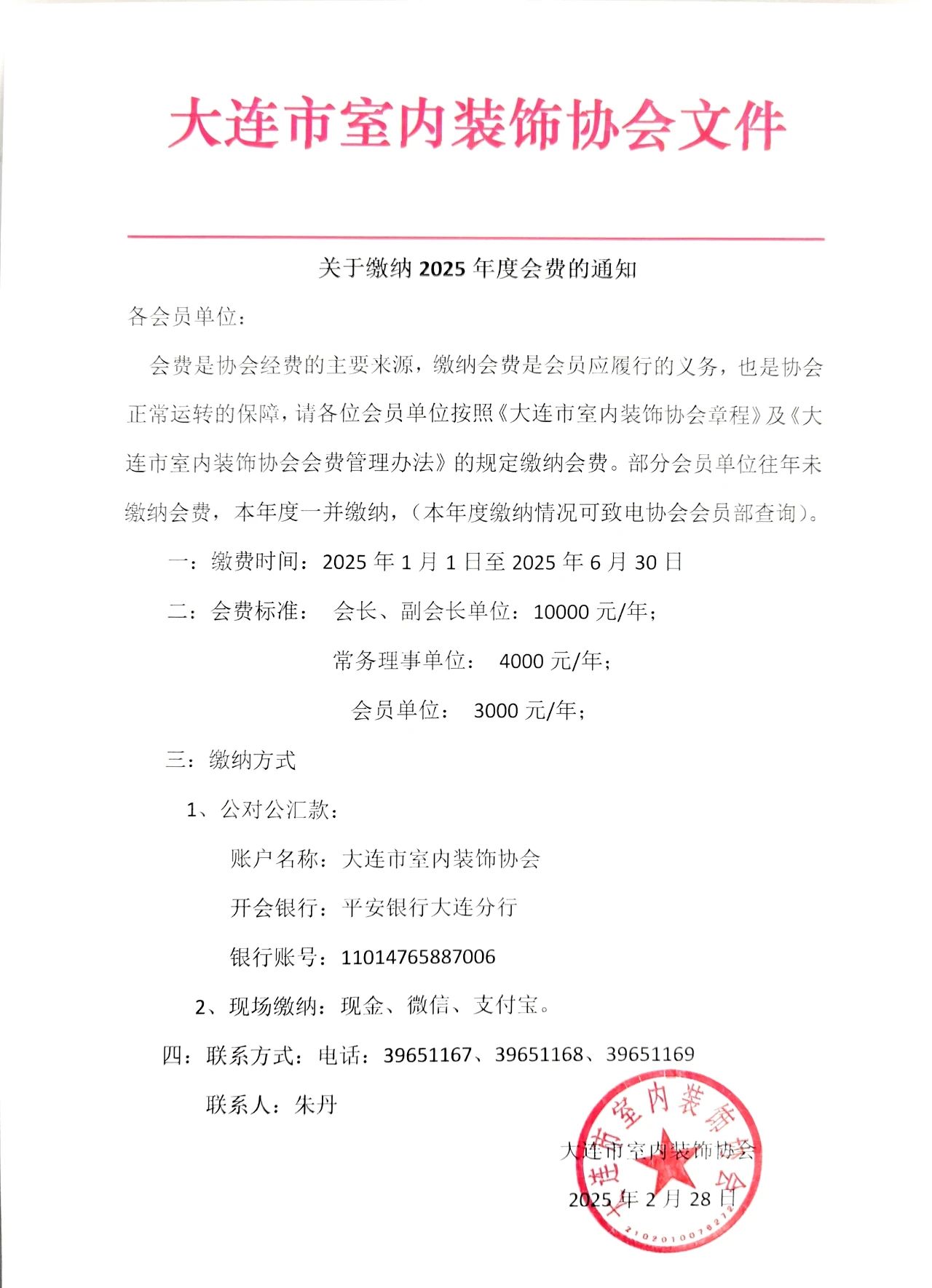 会费是协会经费的主要来源,缴纳会费是会员应履行的义务,也是协会正常运转的保障,请各位会员单位按照《大连市室内装饰协会章程》及《大连市室内装饰协会会费管理办法》的规定缴纳会费。部分会员单位往年未缴纳会费,本年度一并缴纳,(本年度缴纳情况可致电协会会员部查询)。