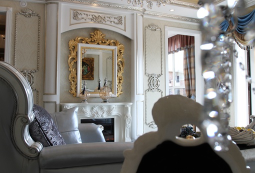 玄关过廊尽头的马赛克和面面相觑的天鹅,客厅的银色沙发,茶几上的蓝色妖姬,餐厅的烛台,昂贵的香槟,增加了空间的法式情调。
